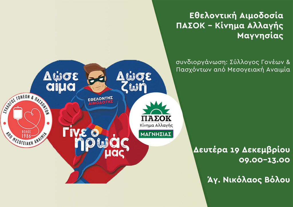 Η Νομαρχιακή Επιτροπή Μαγνησίας του ΠΑΣΟΚ – Κίνημα Αλλαγής διοργανώνει τη Δευτέρα 19 Δεκεμβρίου 2022 και ώρα 09:00 – 13:00, εθελοντική αιμοδοσία στο προαύλιο του Αγίου Νικολάου, στο κέντρο του Βόλου. Η δράση της εθελοντικής αιμοδοσίας συνδιοργανώνεται με τον Σύλλογο Γονέων και Πασχόντων από Μεσογειακή Αναιμία Βόλος 1986 και την απαραίτητη βοήθεια του Τμήματος Αιμοδοσίας Γ.Ν. Βόλου «Αχιλλοπούλειο», που θα μας παρέχει προσωπικό και εξοπλισμό με την εξωτερική μονάδα του.