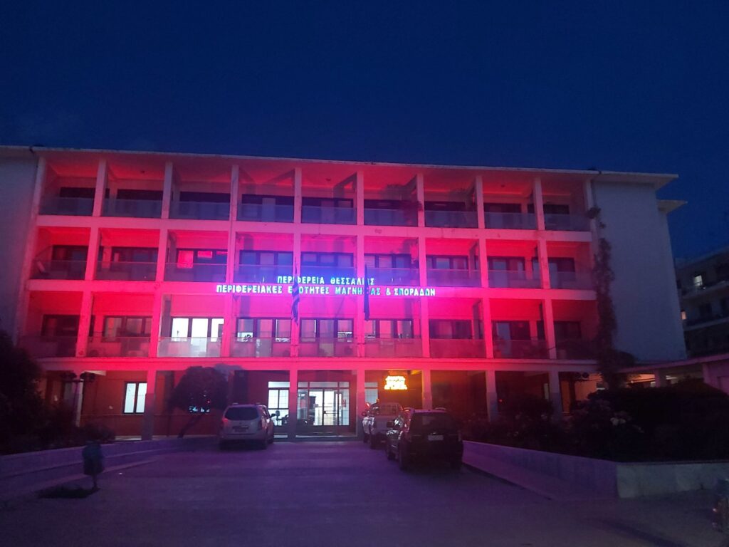 Στα κόκκινα φωταγωγήθηκε το κτήριο της Περιφερειακής Ενότητας Μαγνησίας, για τον εορτασμό της Παγκόσμιας Ημέρας Θαλασσαιμίας.