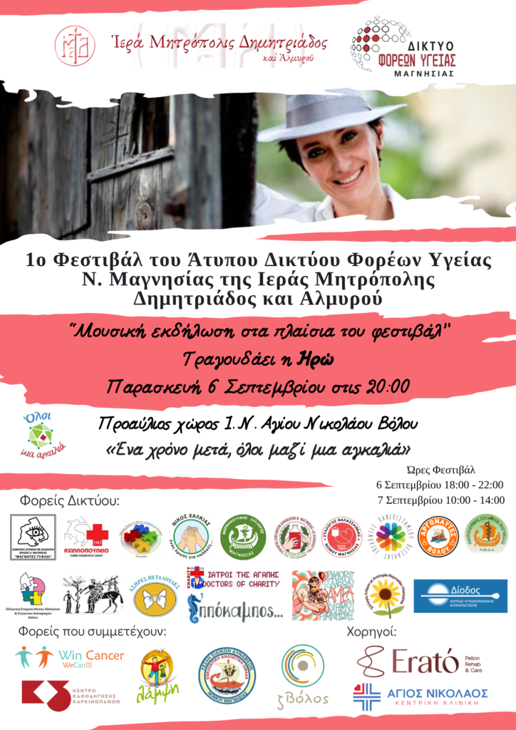 Στο πλαίσιο του 1ου Φεστιβάλ του Άτυπου Δικτύου Φορέων Υγείας Ν. Μαγνησίας της Ιεράς Μητρόπολης Δημητριάδος και Αλμυρού, με τίτλο «Ένα χρόνο μετά, Όλοι μαζί μια αγκαλιά», στον προαύλιο χώρο του Ιερού Ναού του Αγίου Νικολάου, θα πραγματοποιηθεί την Παρασκευή 6 Σεπτεμβρίου 2024 και ώρα 20.00 μουσική εκδήλωση με την Ηρώ. Θα χαρούμε ιδιαίτερα , να μας τιμήσετε με την παρουσία σας . Είσοδος δωρεάν.