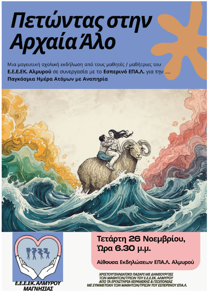 Μια εκδήλωση για την Παγκόσμια Ημέρα Ατόμων με Αναπηρία, από το ΕΕΕΕΚ και το Εσπερινού ΕΠΑΛ Αλμυρού, με τη συμμετοχή του Συλλόγου Θαλασσαιμίας Νομού Μαγνησίας. Σας περιμένουμε!