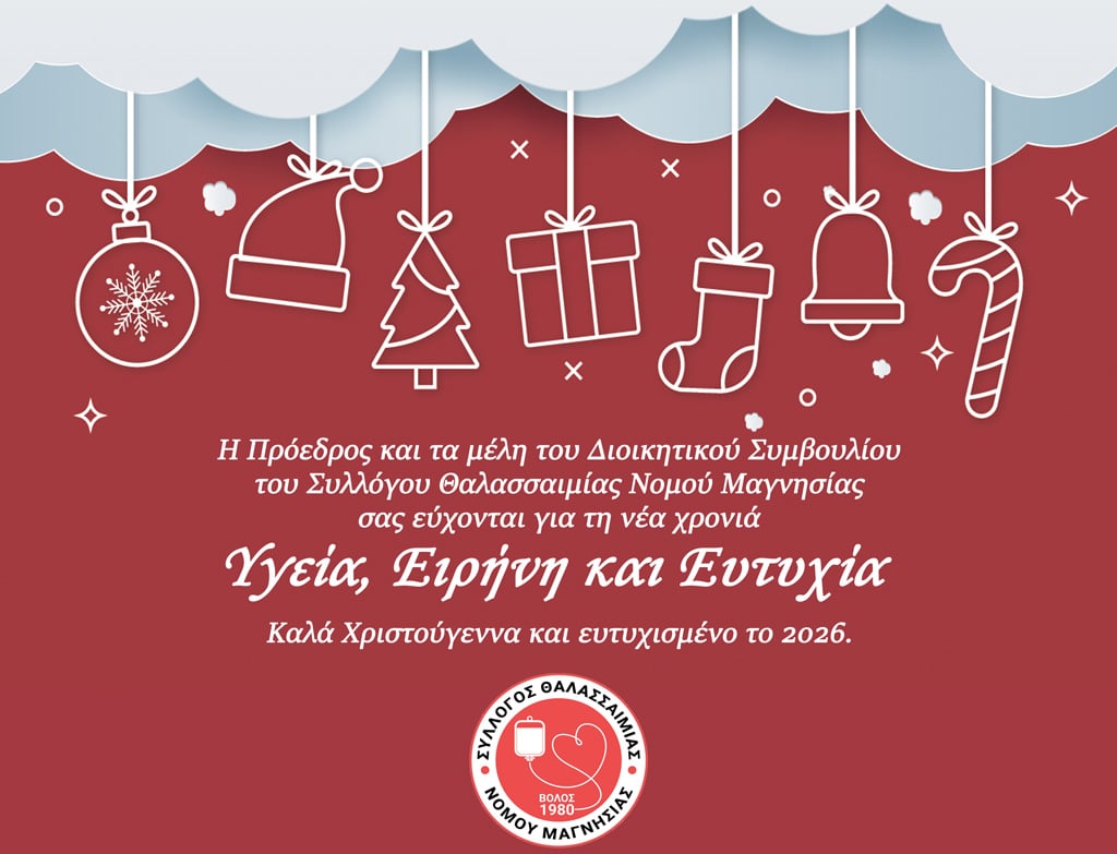 Το Δ.Σ. του Συλλόγου Θαλασσαιμίας Νομού Μαγνησίας εύχεται στα μέλη, στους συνεργάτες και στους φίλους του Συλλόγου, Καλά Χριστούγεννα και ευτυχισμένο το 2026.